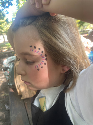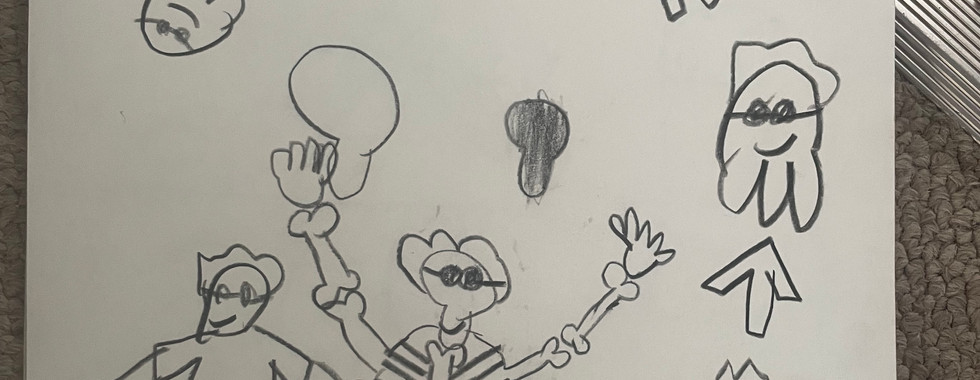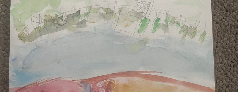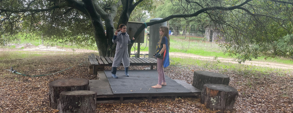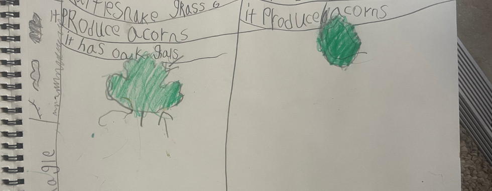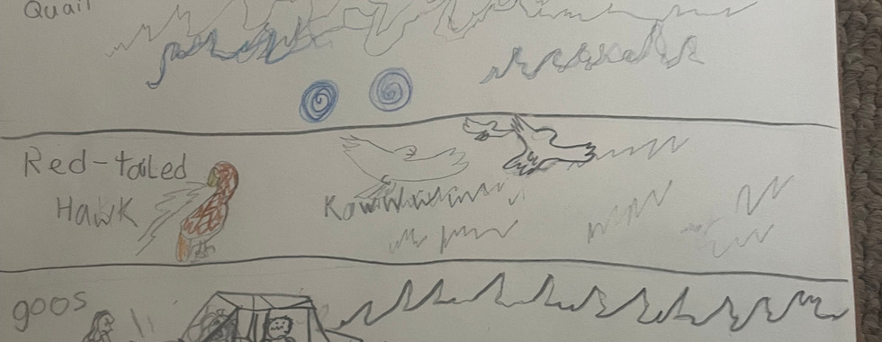 In session 3 we invited Music into our curriculum with the children, collectively asking how we can hear the natural world through the lens of musicality. The earliest music comes directly from nature imitation, so we started first by opening our ears to the music happening around us. As we listened to the songbird chatter and the hawk alarms in the distance we introduced some foundational musical concepts to help us describe what we heard and investigate what it might tell us about our surroundings. We discussed pitch, volume, tempo, and melodic direction in relation to what each quality might tell us about the creature or phenomena generating the sound. The kids were immediately curious and insightful, understanding that a low pitch might mean a larger animal, while a higher pitch likely meant something physically smaller. For tempo we talked about what the speed of our heartbeat can tell us about the way we might be feeling. In this way we rooted each musical element into the natural world around us, and as a group we gained understanding of why certain songs or rhythms might make us feel certain ways. This topic was lively and the kids had ideas about the physicality of sound, music, and the natural world that were very creative and unique.